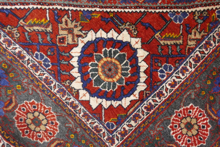 “Emblema”di Qashqai al centro del campo blu con l’impianto “Herati”, interpretato secondo gusto